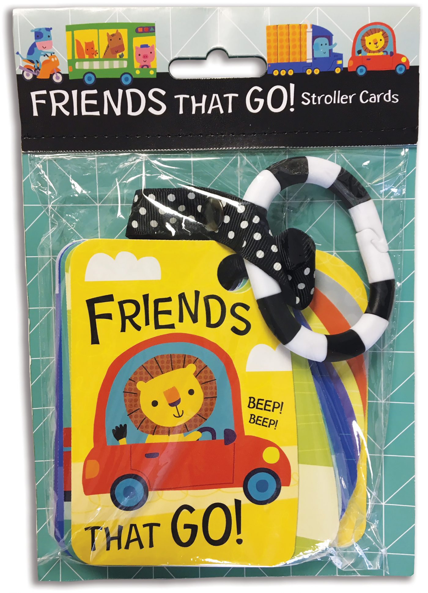 Babies will be entertained by these sweet and portable Friends That Go stroller cards. Each double-sided card features colorful illustrations and introduces a mode of transportation with a friendly animal friend. The ten shaped cards are held securely together with a teething ring, and also includes a ribbon so they can easily be attached to a stroller or car seat. Babies will be amused and delighted by this introduction to vehicles, and will have fun flipping and turning the cards!