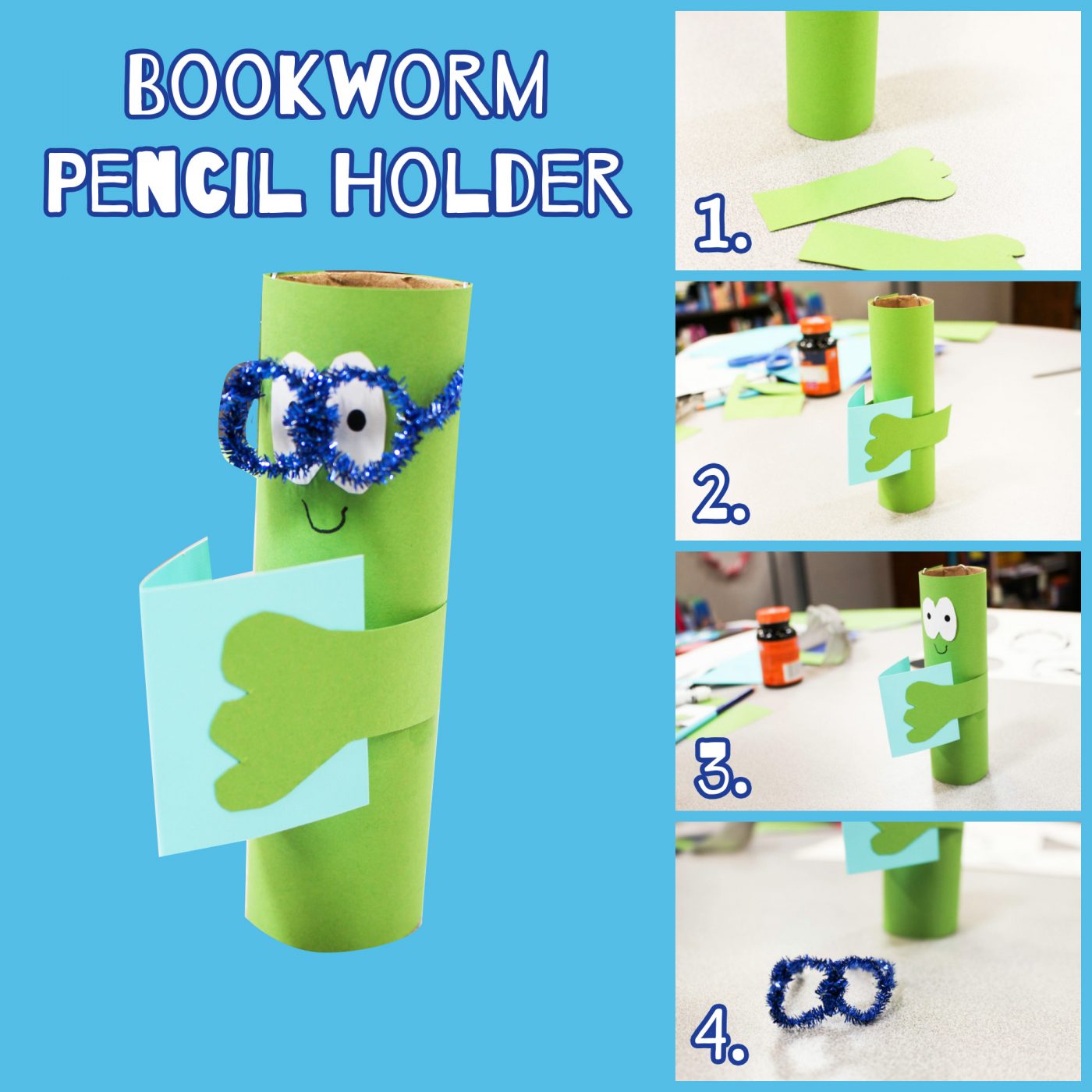 - Bend a piece of pipe cleaner into a pair of glasses. To secure the glasses, use a paper clip, and then fill your bookworm with your favorite pencils!