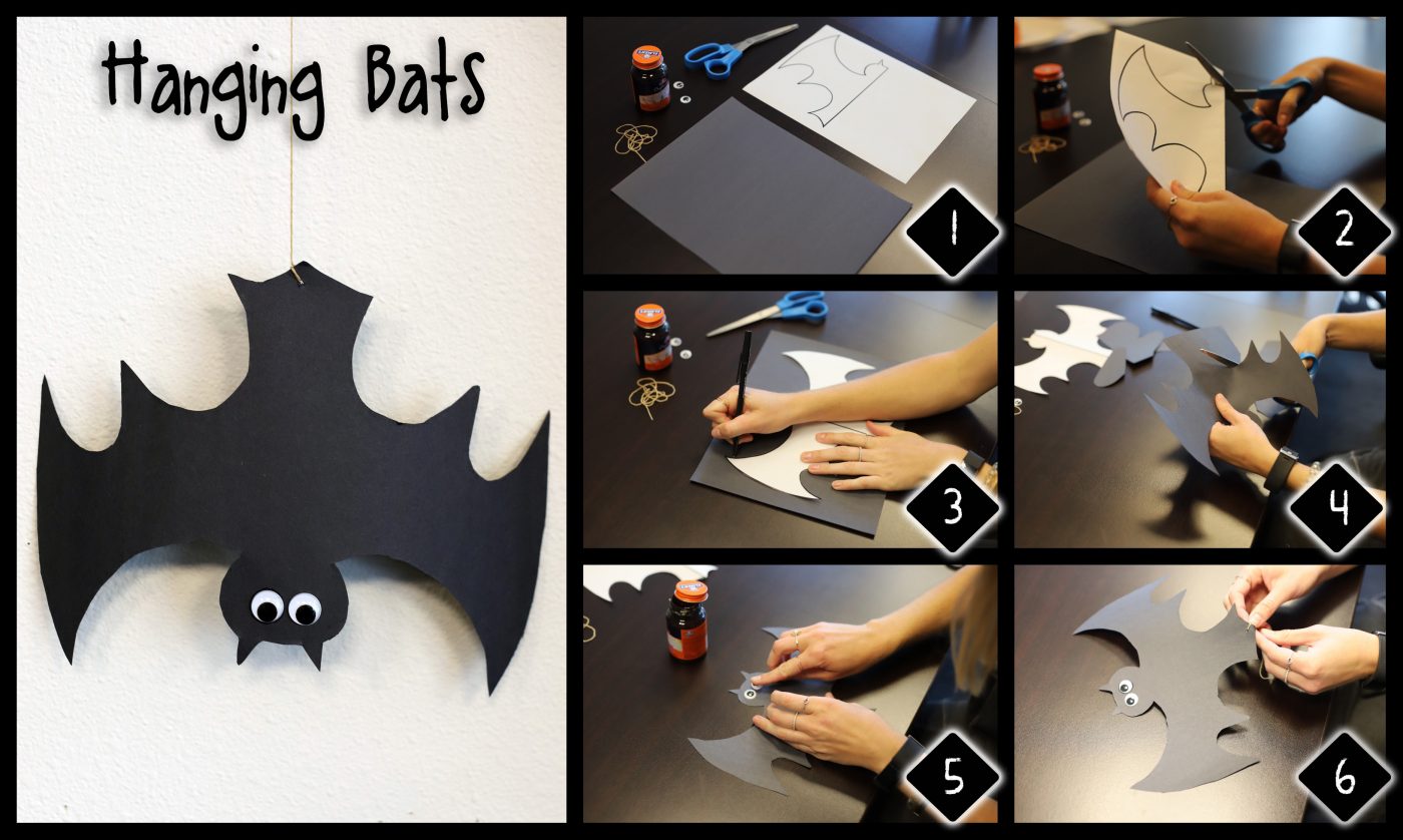 - Using your leftover black construction paper, draw and then cut out two wings for your bat.