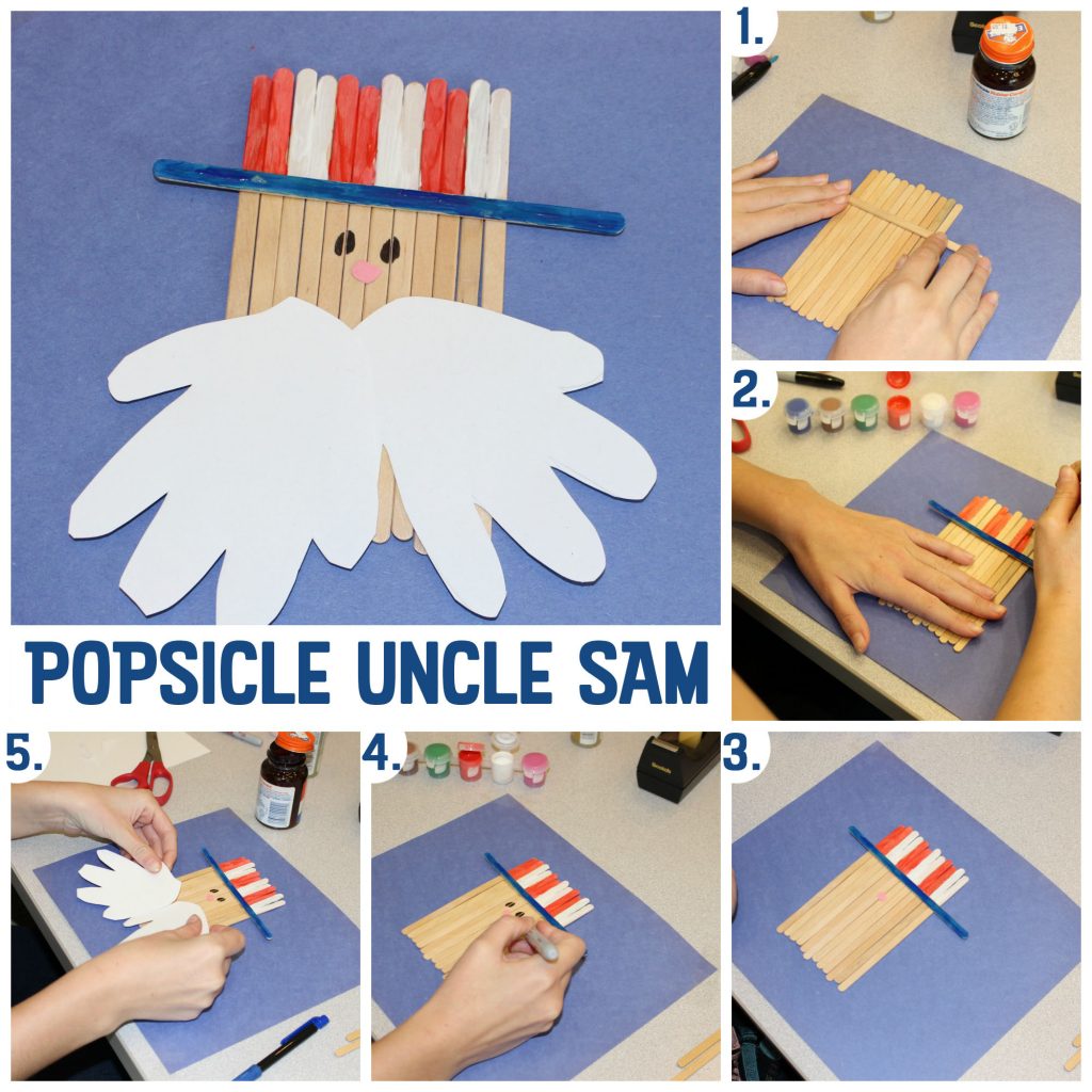 - Glue them on the bottom half of Popsicle sticks and you have your very own Uncle Sam popsicle craft!