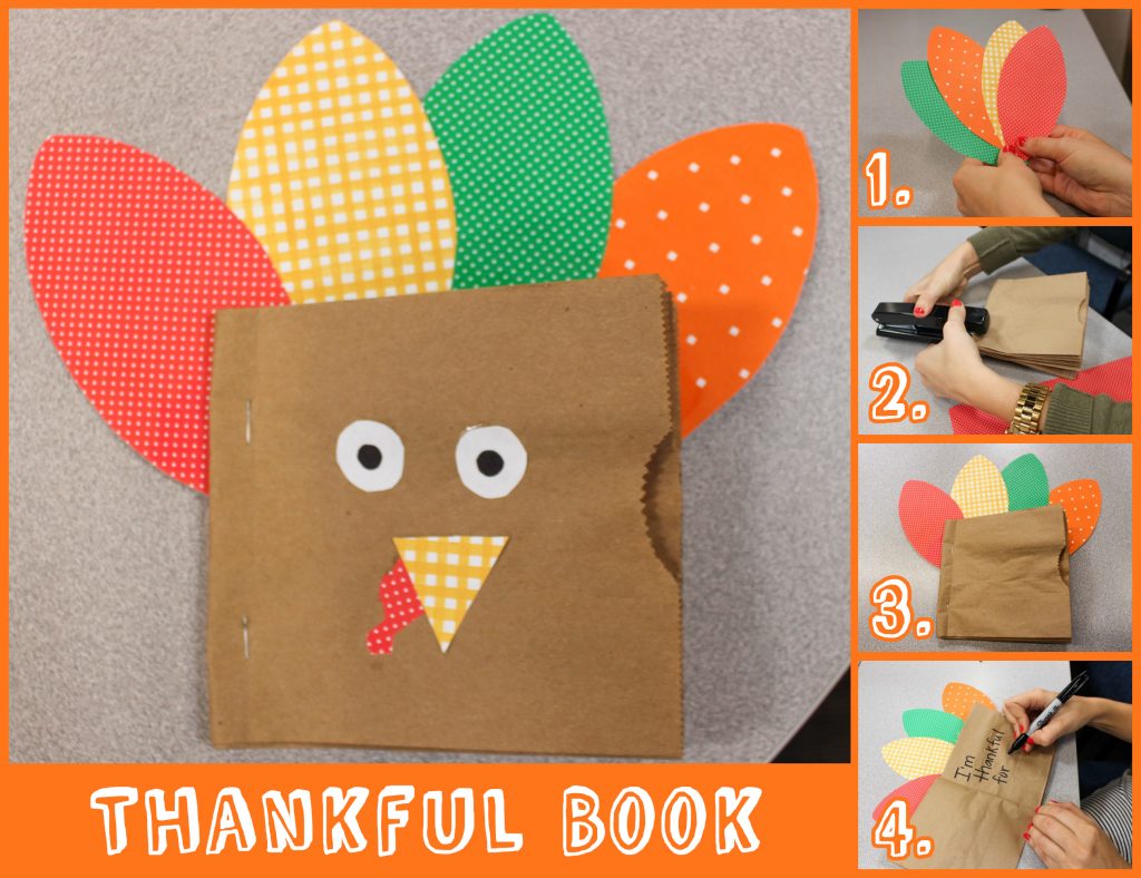 - Turn the book over and glue the feathers onto the back of it. Next, take any scraps of paper to cut out features for the turkey’s face. For the eyes, cut two circles out of white paper and draw on pupils with a marker. Glue the turkey’s face onto the front of the book.
