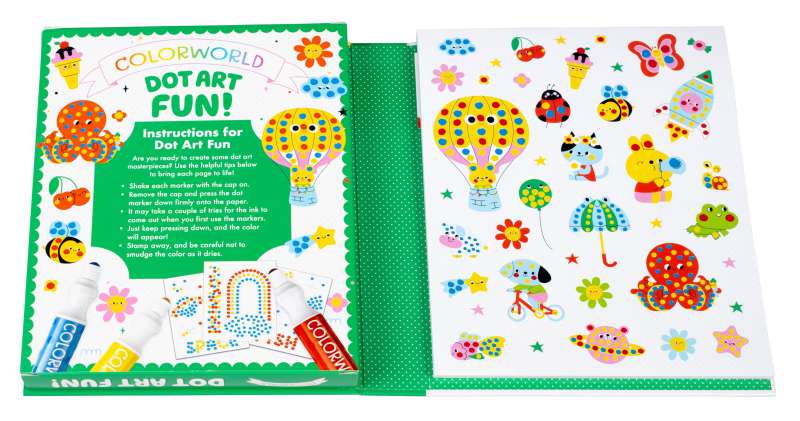Create some spectacular dot art masterpieces! The three jumbo dot markers included in this delightful coloring kit are perfectly shaped for little hands. All kids have to do is gently shake the marker, remove the cap, press down firmly on the pages, and then see how the vibrant colors dot across the pages. Each cute coloring page comes with matching words that will help young artists spell out the illustrations they see, promoting early learning and hand-eye coordination. From flowers and puppies to birthday cakes and butterflies, this coloring kit is full of coloring pages specially designed for the dot markers. With more than 30 stickers included too, this is the perfect gift for little ones who love to color. Let’s dot this!