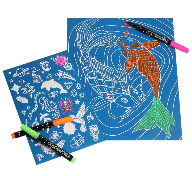 Dive into a mystical world with this stunning coloring kit! Use the included vibrant chalk markers to color dazzling images of incredible planets, animals, nature, and so much more on midnight blue pages. The liquid markers leave bright, bold color on dark backgrounds. This coloring kit also lists tips and techniques on how to use the liquid chalk markers to create the most unique designs. With 6 markers, 32 coloring pages you can tear out and display, and more than 35 customizable stickers just waiting for creative coloring, this kit is perfect for kids who want to design their own world!