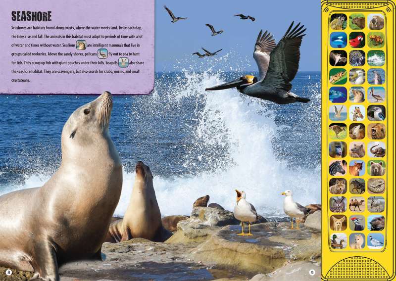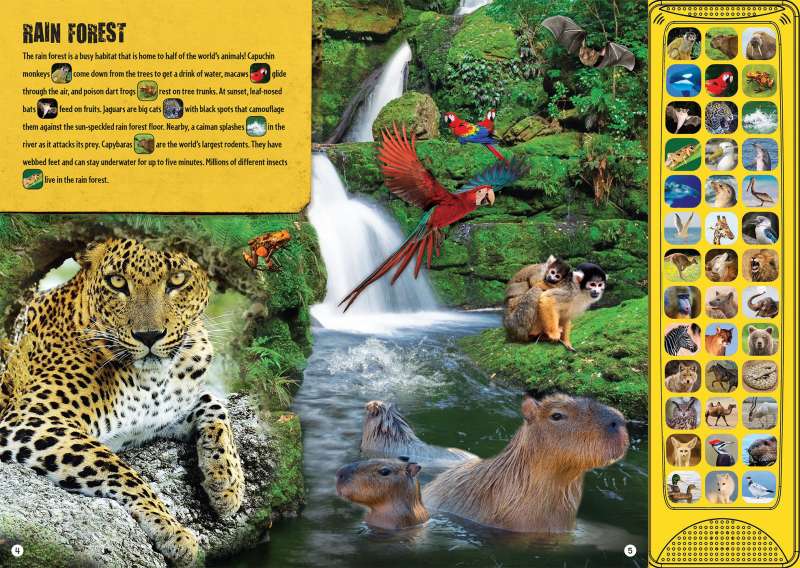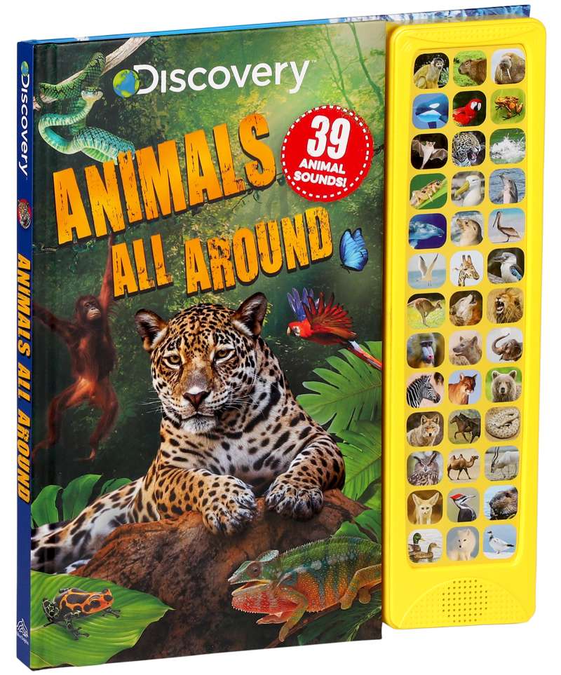 From rain forests to the icy Arctic, animal habitats come to life in Discovery: Animals All Around. This interactive reading experience includes 39 sound buttons that correspond to the animals and habitats covered in this colorful board book. Press the buttons to hear the jaguar roar, the rattlesnake shake its rattle, or the dolphin leap out of the water, and then read about the animals that call each habitat home.