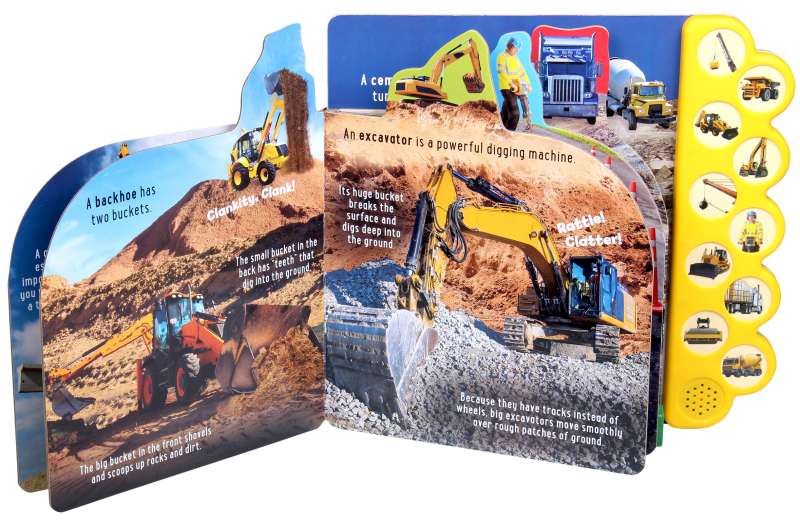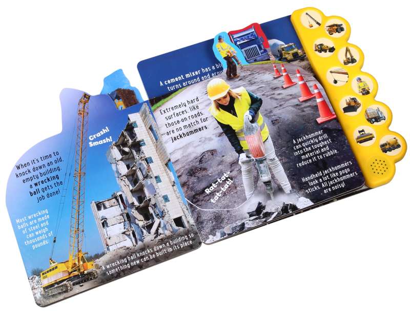 Crash! Bang! Hammer at the Construction Site! is a big, bright board book that is packed full of noisy construction fun! Busy toddlers won't be able to resist pressing the buttons and copying the familiar construction sounds that accompany the colorful photographs on every page. The sturdy picture tabs make it easy for young children to turn the pages to find their favorite machines, and simple descriptive text brings this noisy world to life.