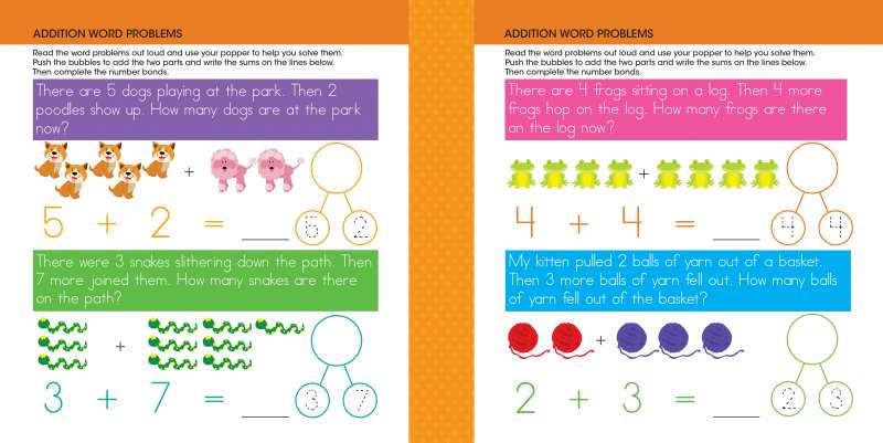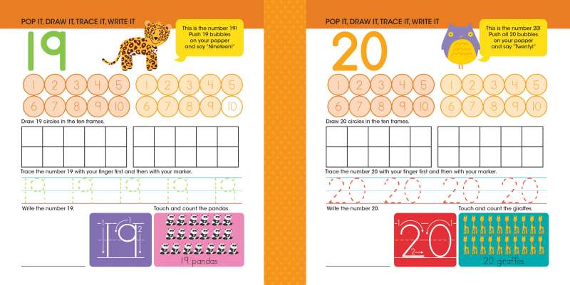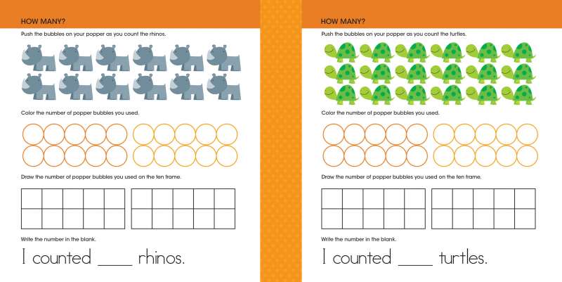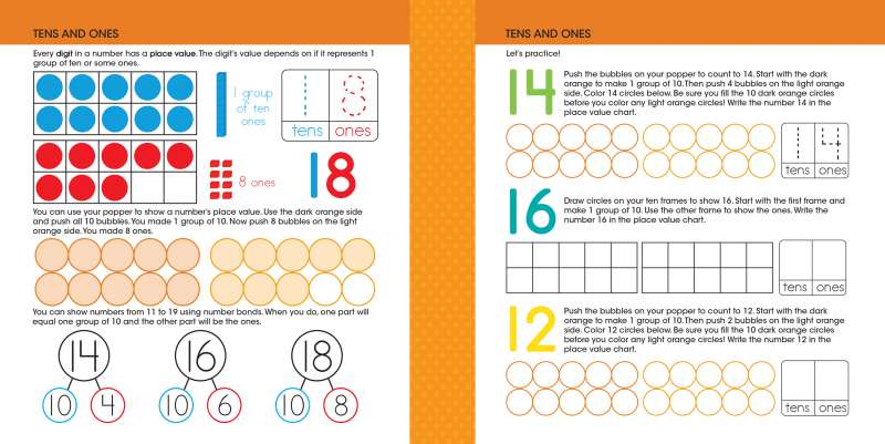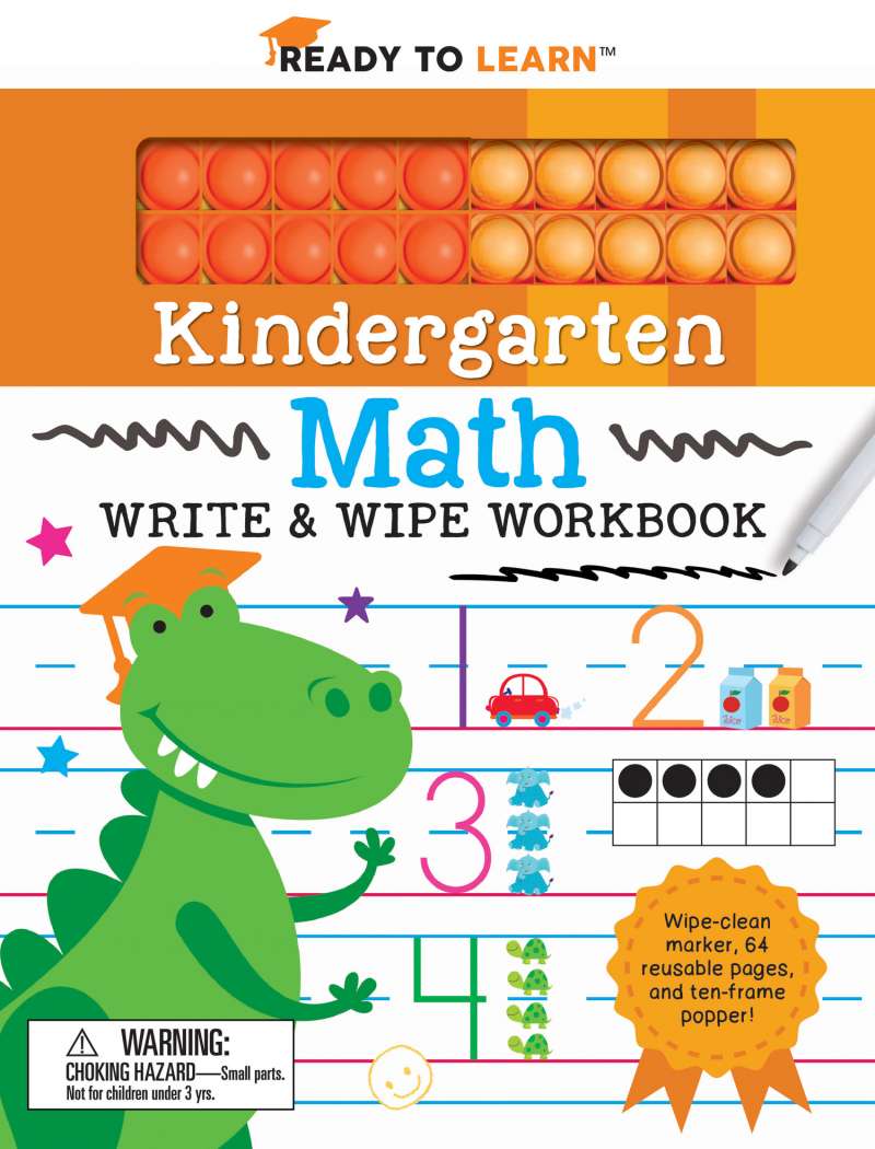 Whether they’re in kindergarten already, preparing for it, or just want a refresher, students ages 4 to 6 need a basic understanding of the concepts they’ll be taught in kindergarten math. Ready to Learn: Kindergarten Math Write & Wipe Workbook with Popper helps kindergarteners learn counting with the removable included silicone 10-frame popper. Ten frames help young children develop number sense by providing them with a visual of numbers. By simply pressing each bubble, children can continue adding bubbles until they reach 10. With practice, children will recognize the visual representation of the number without counting. They can then practice subtraction by releasing each bubble. The hands-on 10-frame strengthens kindergarteners’ understanding of numbers and allows them to master number recognition quickly. Through illustrated, easy-to-understand write-and-wipe exercises, children will learn number sense and simple addition and subtraction. This colorful, engaging workbook also includes a wipe-off marker so kids can practice the exercises over and over again.