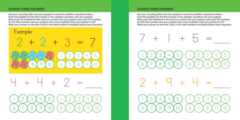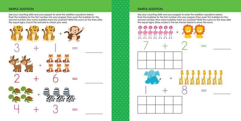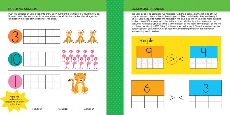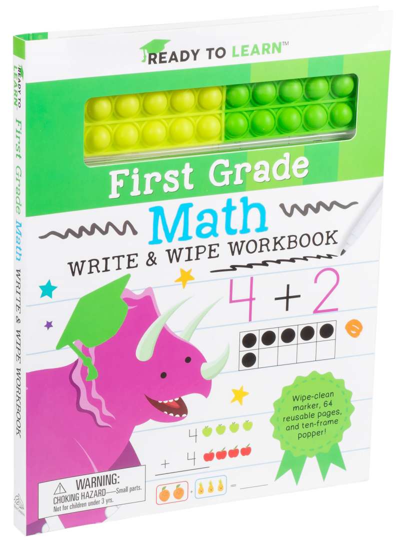 First-graders and first-graders-to-be will be excited to learn foundational math skills with the Ready to Learn: First Grade Math Write & Wipe Workbook with Popper. The removable included silicone 10-frame popper offers a hands-on approach to understanding numbers, adding, subtracting, ordering, and comparing numbers. Engaging and colorful write-and-wipe activities strengthen pen control skills, and the poppers allow kids to develop number skills quickly. Ten frames help children develop number sense by providing them with a visual of numbers. By simply pressing each bubble, children can continue to add bubbles until they reach 10. They can then practice subtraction by releasing each bubble. Ideal for students ages 5 to 7, the Ready to Learn: First Grade Math Write & Wipe Workbook with Popper offers an interactive learning experience that makes math interesting and accessible.