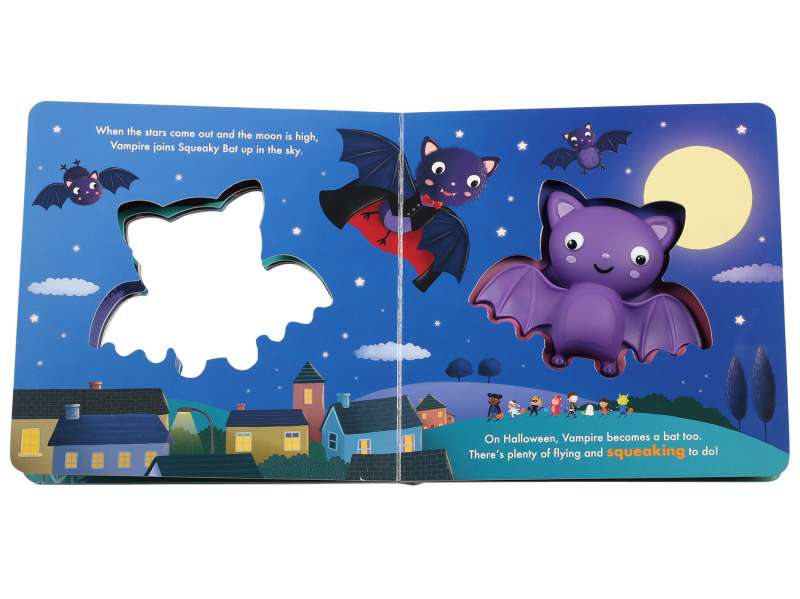 It’s Halloween, and Squeaky Bat can’t help but squeak with joy because it’s her favorite time of year! An adorable, squishy vinyl bat shows through cut-outs in the center of this book to appear on every page. Young readers will love squeezing the bat and hearing her squeak in this fun, rhyming board book!