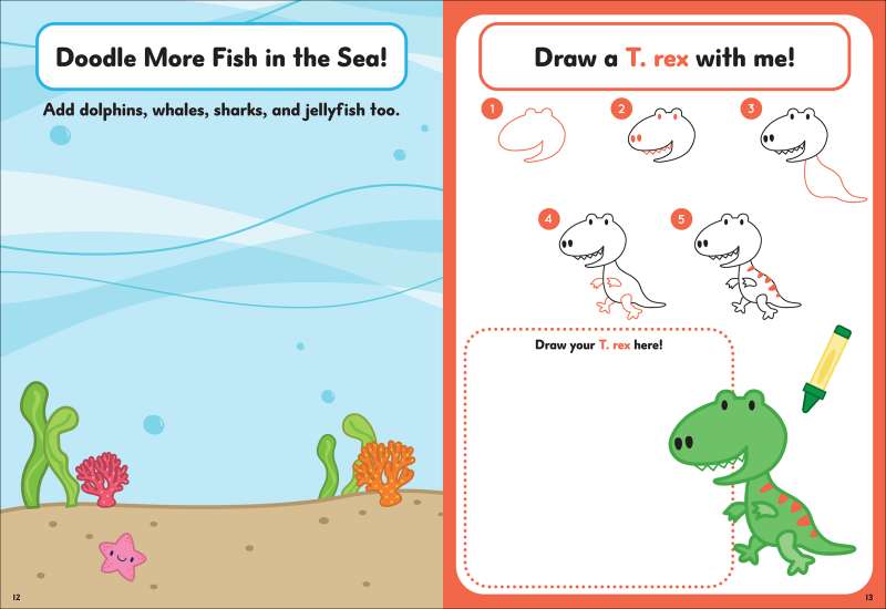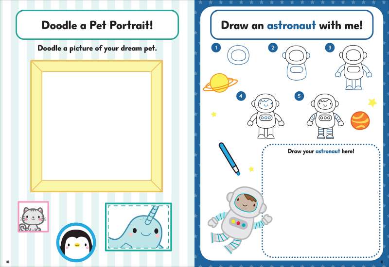 Have you ever wanted to learn to draw the cutest critters ever? Now you can with Draw With Me! This adorable activity book is jam-packed with easy step-by-step instructions for drawing everything from pirate ships to narwhals. Sprinkled among the drawing pages are tons of doodling pages to get your creative juices flowing, including doodling fish in an underwater scene, hot-air balloons in the sky, a delicious ice-cream cone, silly monsters, and more! And more than 30 stickers are included for even more creative fun! Perfect for rainy days or road trips, Draw With Me! has simple drawing instructions and doodle prompts that spark imagination. Grab your favorite crayon or pencil and get ready to doodle and draw!