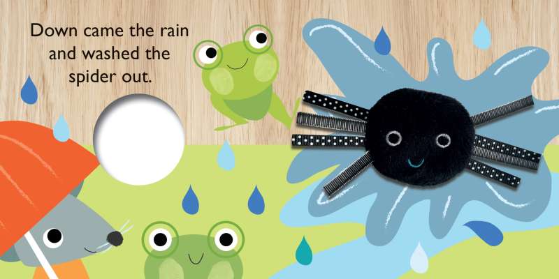This super sweet finger puppet book with adorable illustrations will keep little ones engaged as they sing along with the beloved rhyme of The Itsy Bitsy Spider. Featuring a soft plush spider finger puppet built into the book that brings the Itsy Bitsy rhyme to life, this book can help sharpen motor skills and encourage interactive play. Full of bright colors and rhyming text, this board book stimulates babies’ senses and makes story time fun for the whole family!