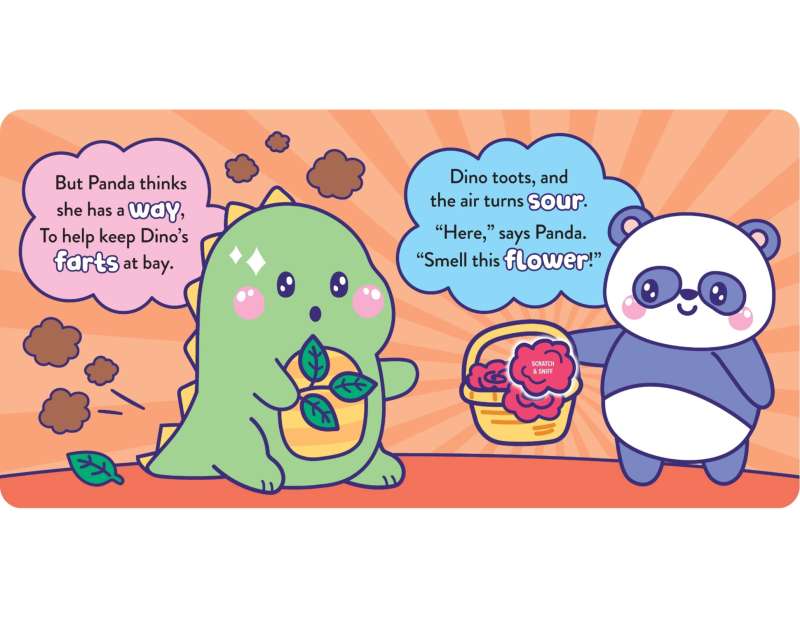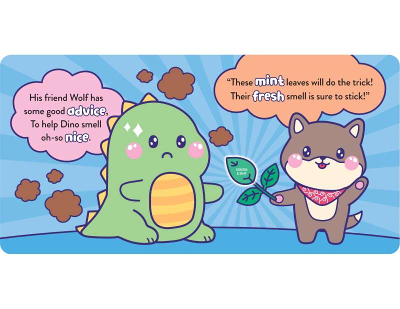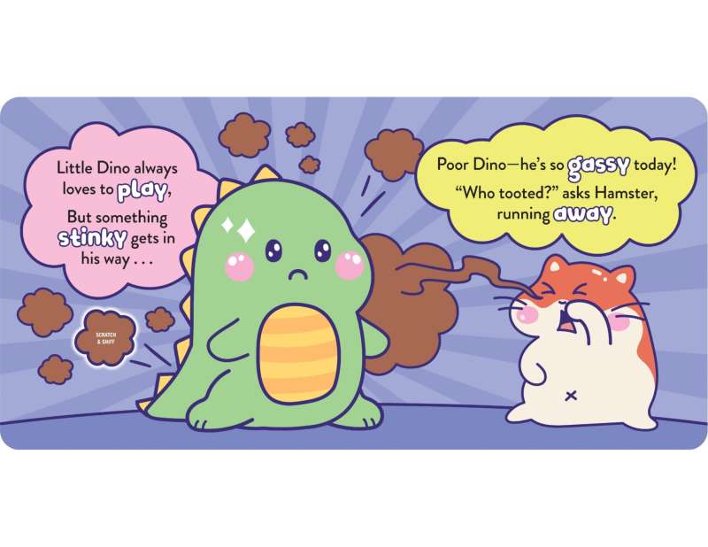 Dino is an adorable dinosaur, but he has a silly problem—his farts are extra stinky! Determined to change his stinky farts, Dino goes on an adventure with his friends to find a way to smell sweet. But is having smelly farts really so bad? This hilarious rhyming board book will make kids laugh with its first stinky scent to scratch and sniff, and it will relieve parents with the other sweet scents that follow. With 5 different scents—from farts to roses, lemons, and more—there is a scent for everyone! Heartfelt and including cute kawaii-style illustrations, this board book is perfect for kids who love to sniff silly scents and laugh along with a sweet story.