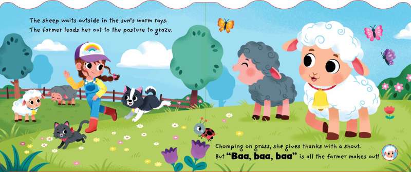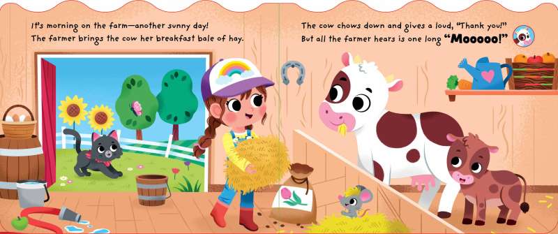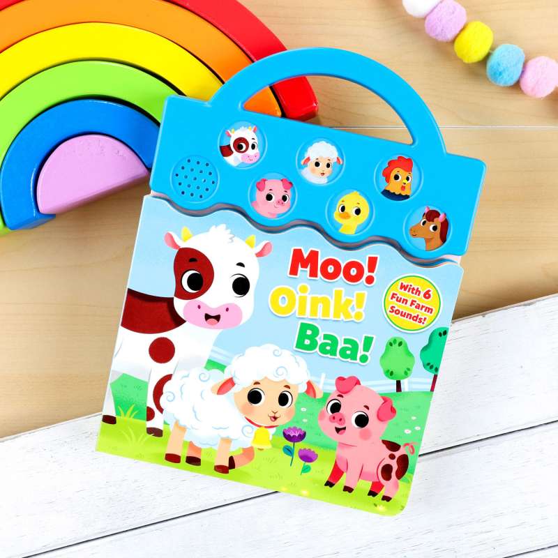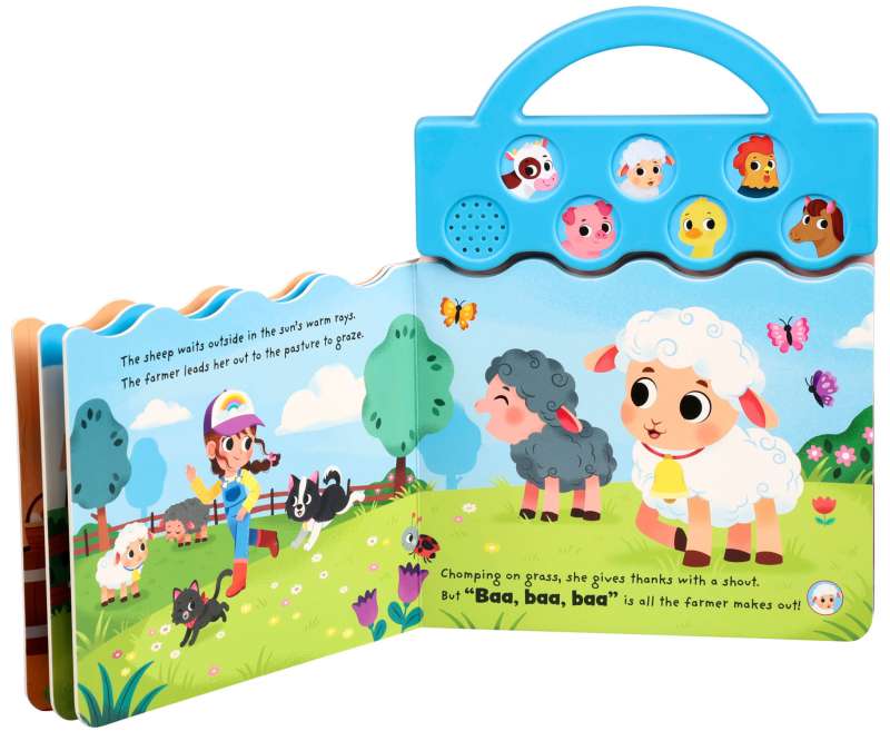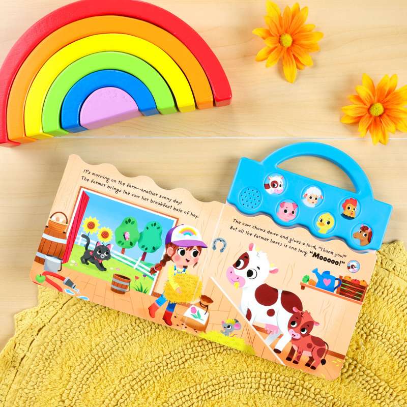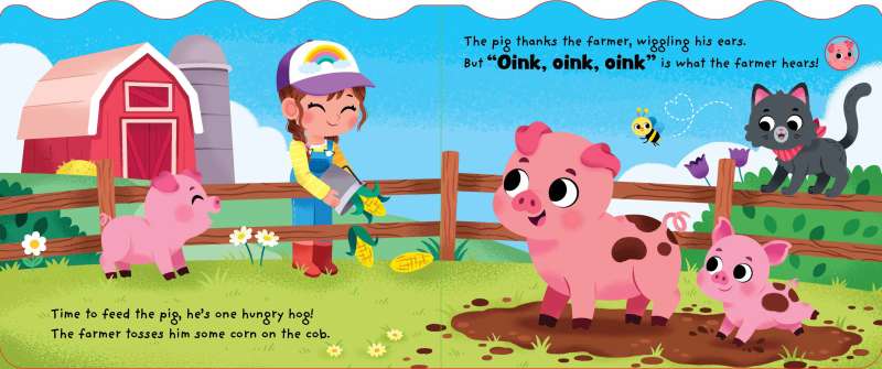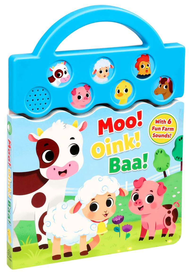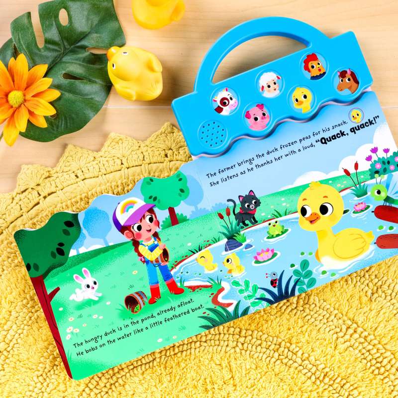 It’s feeding time on the farm, and the animals can barely contain their excitement! Little ones will love reading this rhyming story as the cow, pig, sheep, duck, rooster, and horse are fed around the farm in this illustrated board book with a handle and 6 interactive sound buttons to press throughout. With real animal noises and a jaunty farm tune for each animal, this on the go sound book is a kind of a pig deal!