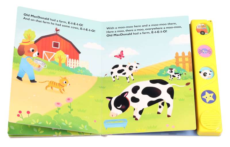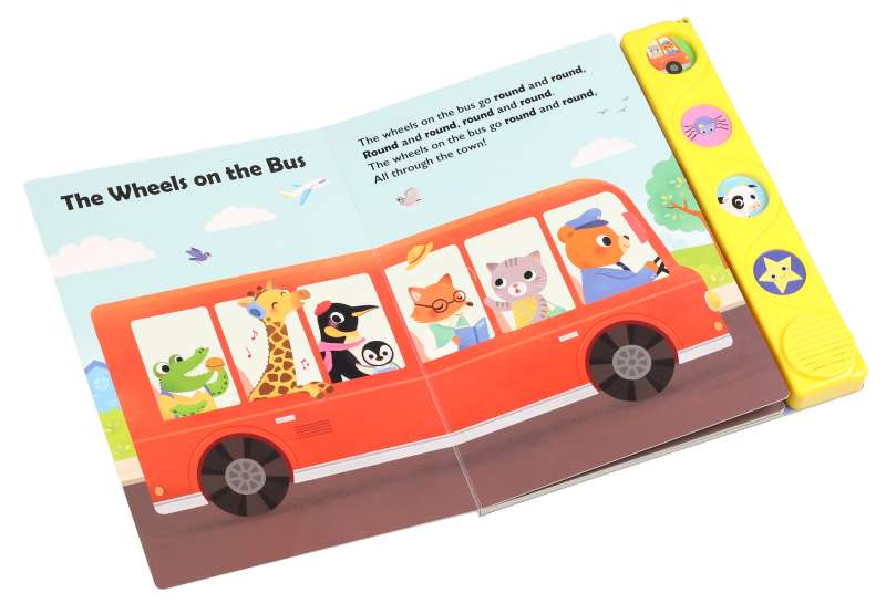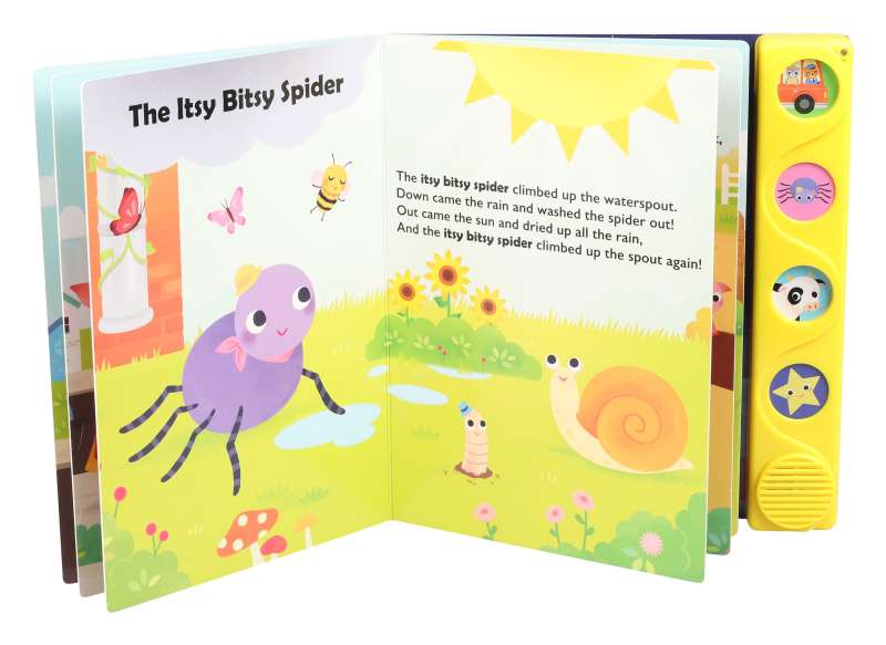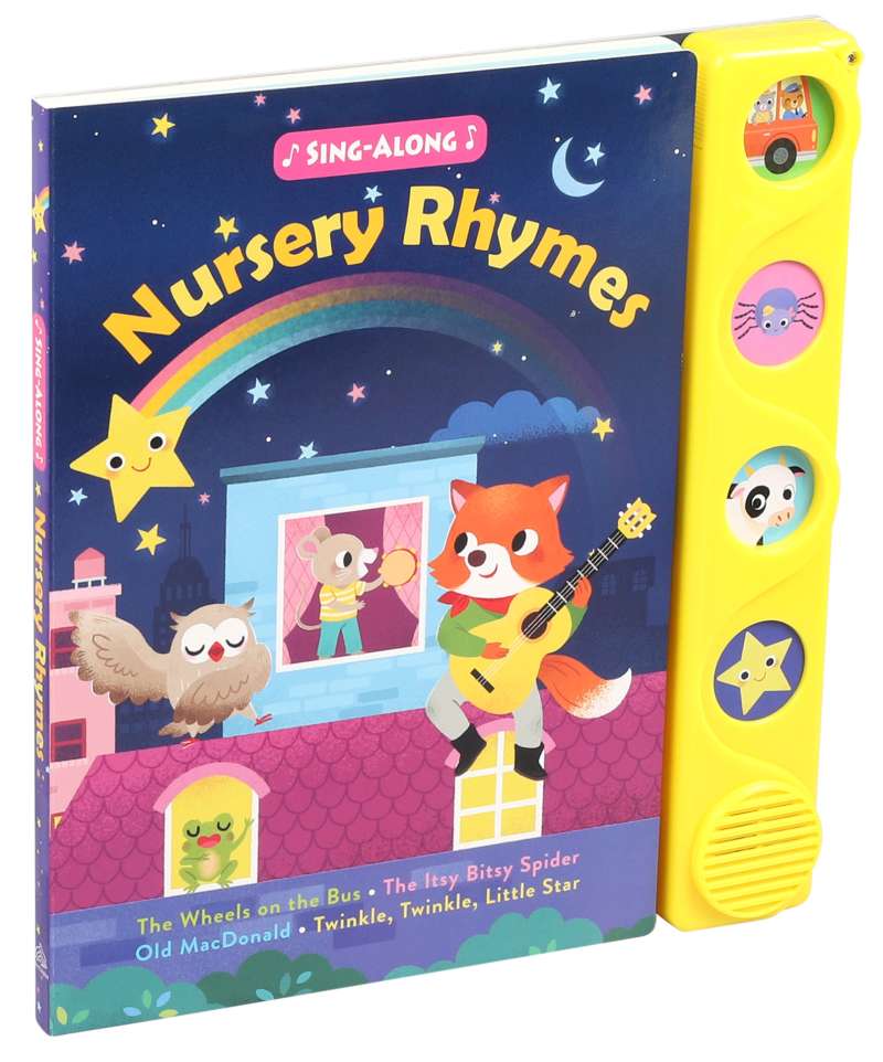Little ones will love pressing the four sound buttons and hearing their favorite instrumental nursery rhymes in this musical collection! Sing-Along Nursery Rhymes features adorable illustrations and the lyrics to beloved nursery rhymes so parents and children can play the music and sing along together. Hop on the bus, crawl up the water spout, visit Old MacDonald’s farm, and watch Little Star sparkle in the sky in this hands-on musical collection!