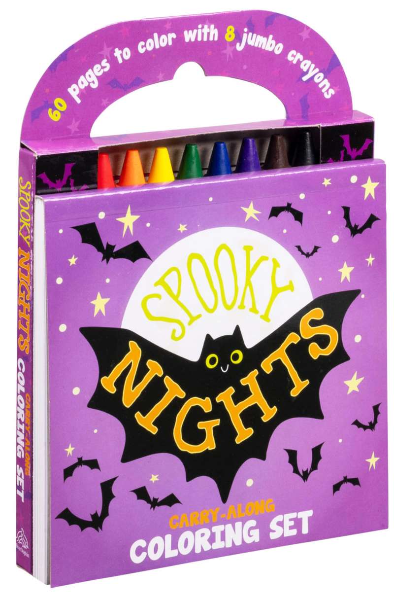 The Spooky Nights Carry-Along Coloring Set has a handle that makes it easy for kids to tote it along as they celebrate Halloween! The set includes 8 colorful jumbo crayons and a book with 60 holiday-themed pages of spooky and sweet coloring and activity fun—there are kids and critters in costumes to color, ghosts, bats and pumpkins galore, and mazes, matching, and more engaging activities to complete!