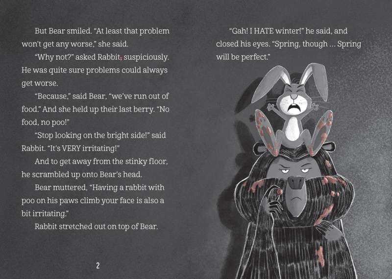Rabbit is upset that Spring isn’t all that he thought it would be. But Bear thinks if they work hard, they can make things better. Rabbit has a much better plan—to go across the lake in search of a perfect world. What will Rabbit and Bear find on this very long journey with no breakfast? Find out in this hysterical addition to the beloved Rabbit & Bear series. With humorous illustrations throughout, the Rabbit & Bear series captures the attention of readers with its honest characters, sticky situations, and occasional poop jokes.