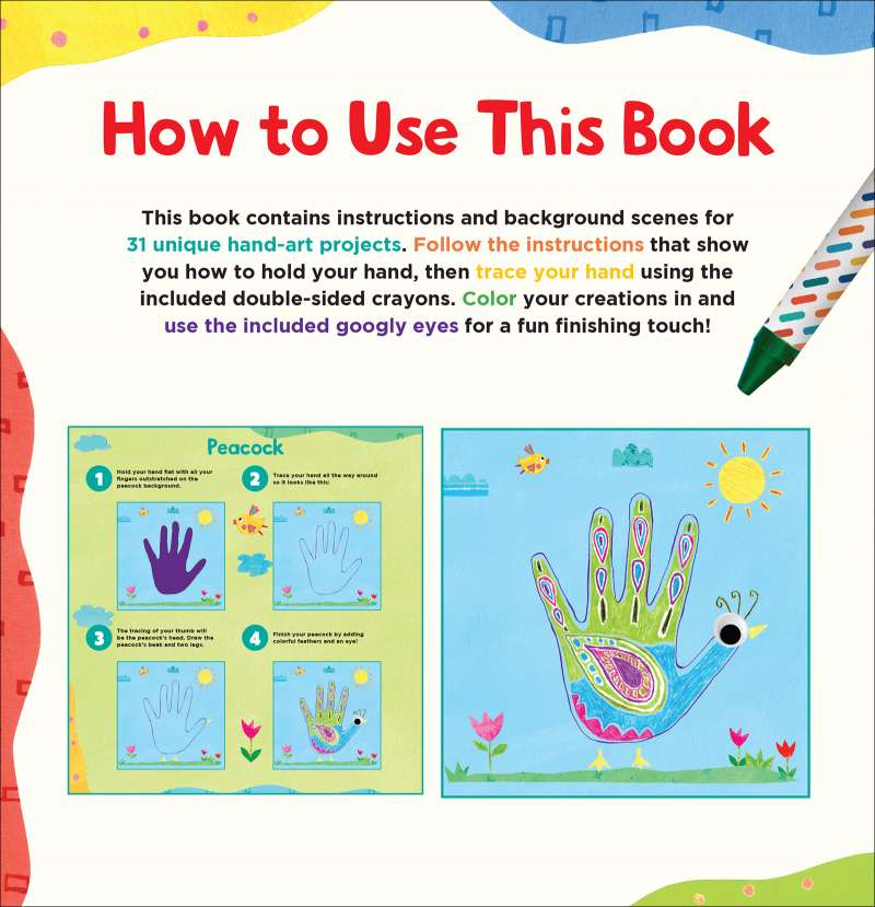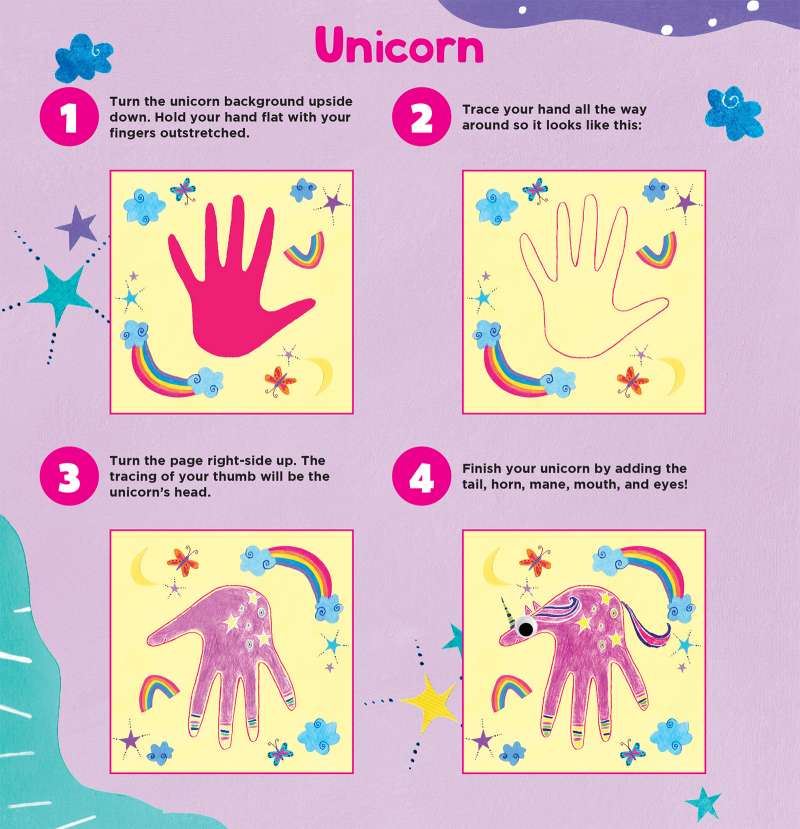 The ubiquitous hand-print turkey is cute, but get ready for absolute adorableness in the shape of little hands turned into llamas, unicorns, sea monsters, and more! Kids can follow super-simple pictorial instructions that show how to hold their hands and then trace them on the colorfully illustrated backgrounds. Add color using the included double-sided crayons, and finish with a flourish by adding on some googly eyes. Dozens of easy projects mean little hands will be busy for hours creating art that is fridge-worthy all year round.