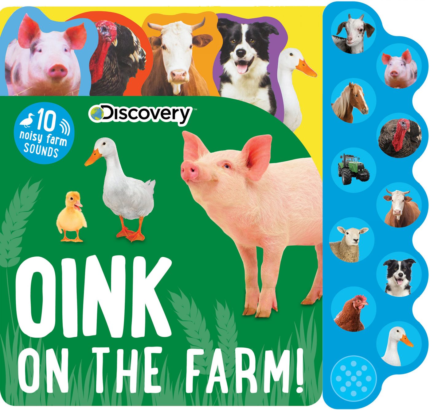 This big, bright board book is packed full of noisy farmyard fun! Busy toddlers won’t be able to resist pressing the buttons and copying the familiar animal sounds that accompany the colorful photographs on every page. The sturdy picture tabs make it easy for young children to turn the pages to find their favorite farm animals, and simple descriptive text brings the noisy world to life.