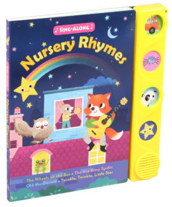Consider this book an intro to those beloved songs that all babies and toddlers seem to crave on repeat. Each sound button emits an instrumental version of a popular nursery rhyme, while colorful pictures and boldfaced text bring Itsy Bitsy Spider, Wheels on the Bus and more to life.