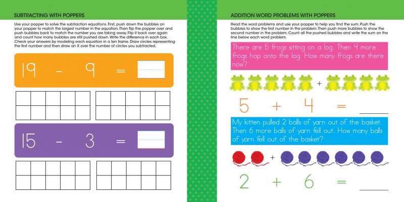 First-graders and first-graders-to-be will be excited to learn foundational math skills with the Ready to Learn: First Grade Math Write & Wipe Workbook with Popper. The removable included silicone 10-frame popper offers a hands-on approach to understanding numbers, adding, subtracting, ordering, and comparing numbers. Engaging and colorful write-and-wipe activities strengthen pen control skills, and the poppers allow kids to develop number skills quickly. Ten frames help children develop number sense by providing them with a visual of numbers. By simply pressing each bubble, children can continue to add bubbles until they reach 10. They can then practice subtraction by releasing each bubble. Ideal for students ages 5 to 7, the Ready to Learn: First Grade Math Write & Wipe Workbook with Popper offers an interactive learning experience that makes math interesting and accessible.