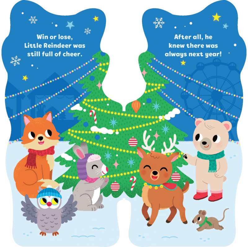 It’s Christmastime, and Little Reindeer can’t wait to play games at the Christmas carnival! Follow Little Reindeer as he plays tinsel tag, pulls a sleigh, and more in this adorable shaped board book with foil and soft flocking on the cover that’s perfect for little hands.
