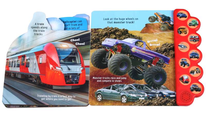 This big, bright board book is packed full of noisy fun with things that go! Busy toddlers won't be able to resist pressing the buttons and copying the familiar vehicle sounds that accompany the colorful photographs on every page. The sturdy picture tabs make it easy for young children to turn the pages to find their favorite vehicles, and simple descriptive text brings the noisy world to life.